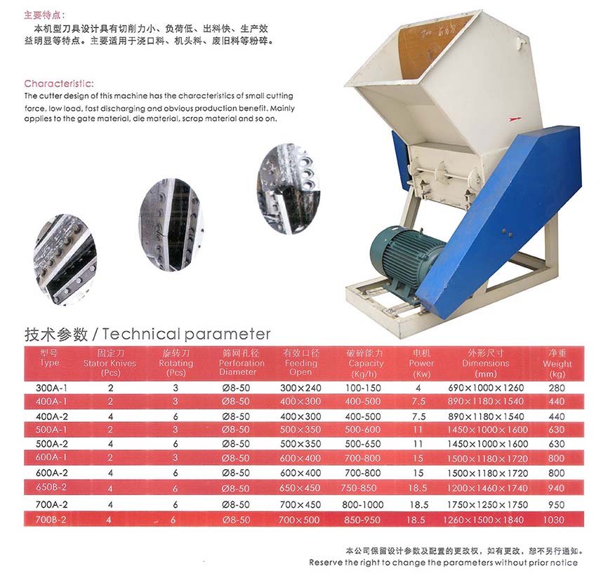 1:粉碎机操作方便,换到简便快捷,平行刀宽大的结构适合破碎大体积薄料产品。